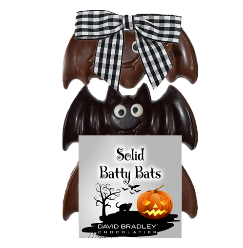 These adorable Batty Bats are flying to you this Halloween! Three bats in a pack two milk, one dark decorated with two sugar eyes and tied with a Halloween bow are a Halloween treat you’ll be happy to eat. Net Weight 2.5oz.