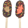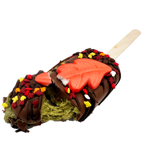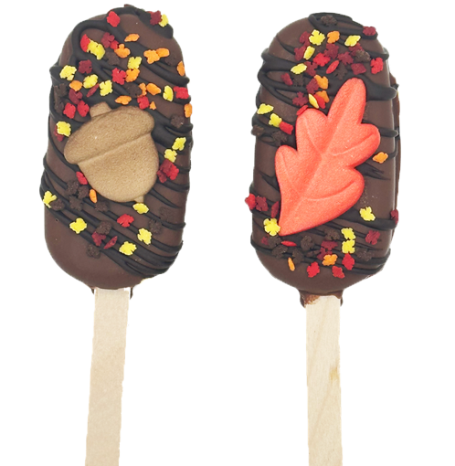 Enjoy the viral trend of the chocolate Dubai bar… on a stick. Milk chocolate filled with Pistachio Cream and Crunchy Kataifi, then topped with edible Fall decos and a sugar Leaf.